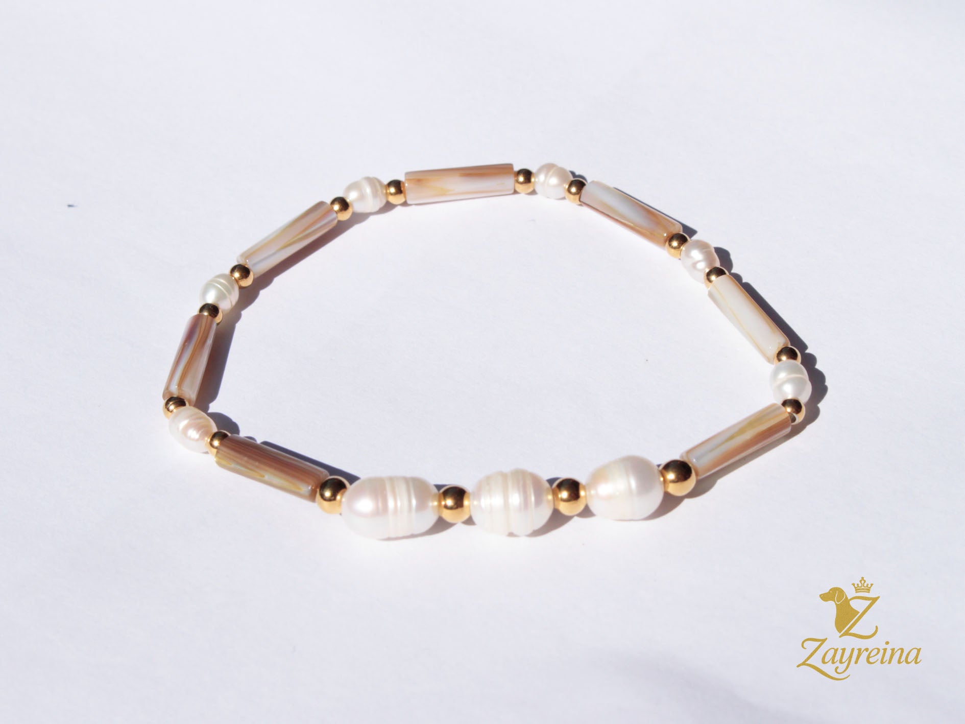 Bracelet élastique avec tubes en coquillage naturel beige, neuf perles naturelles et détails en acier inoxydable doré.