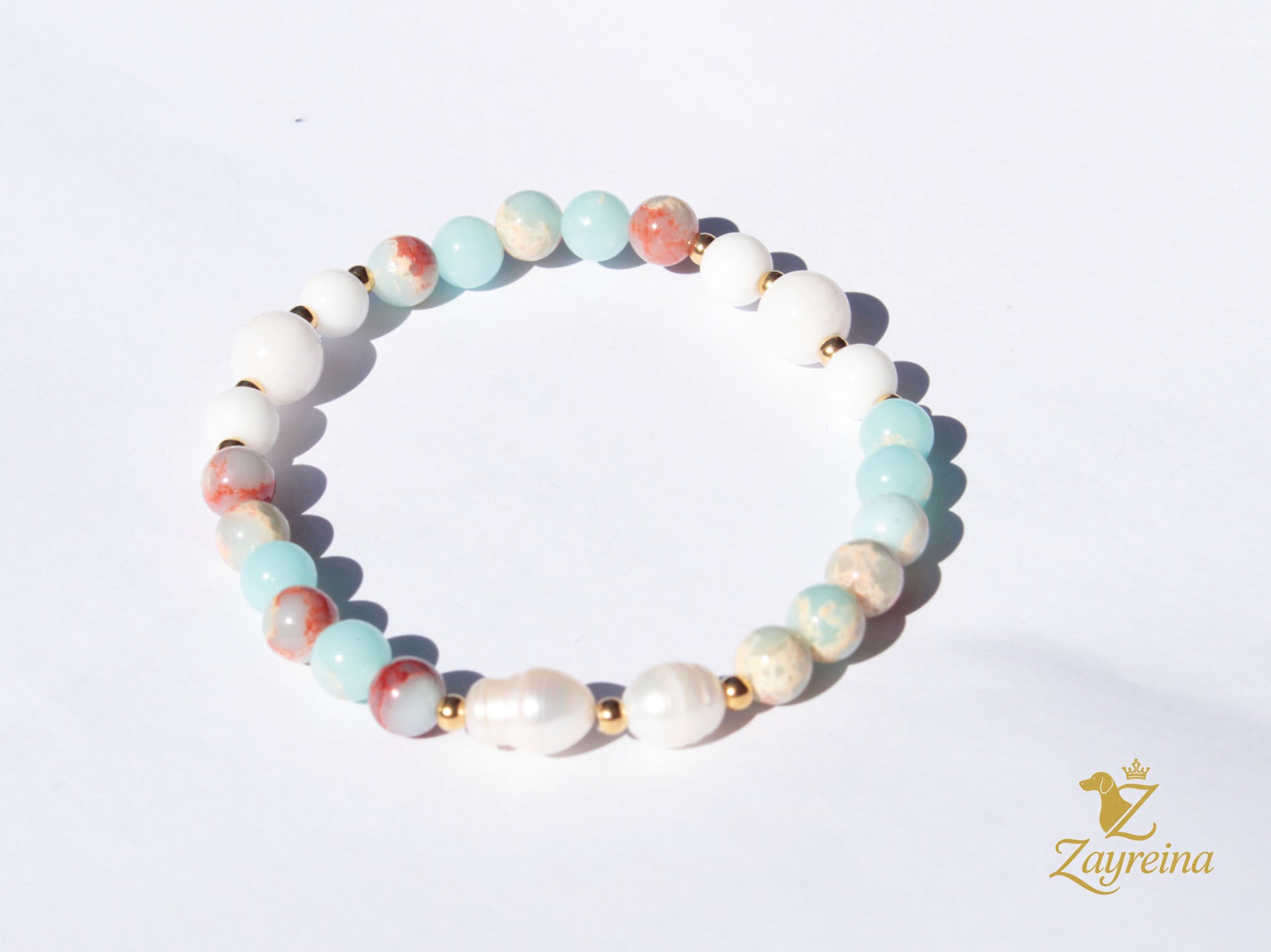 Bracelet élastique bleu et blanc avec deux perles naturelles et détails en acier inoxydable doré.