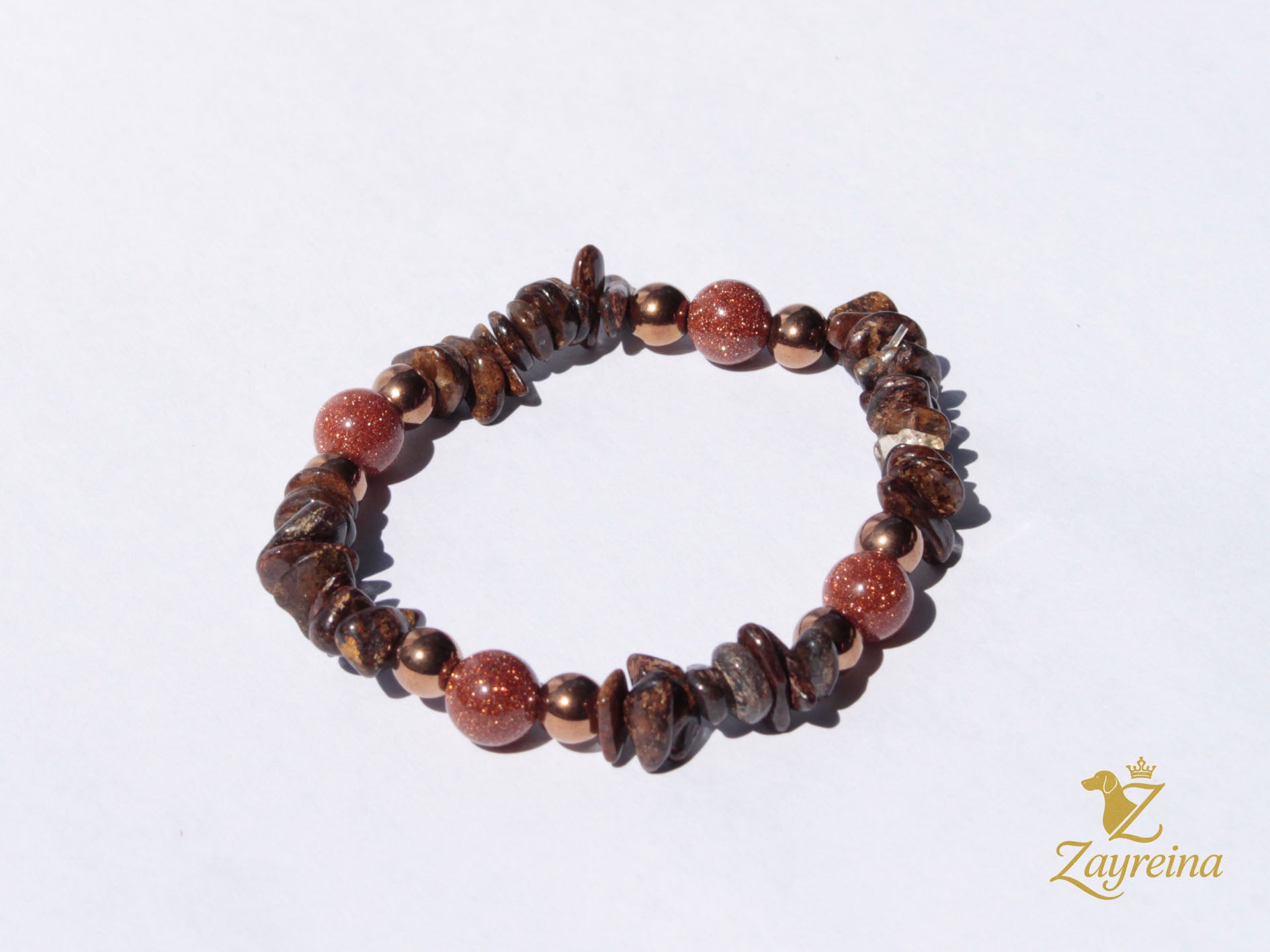 Bracelet élastique en pierre de soleil dorée scintillante, hématite bronze et éclats de bronzite.