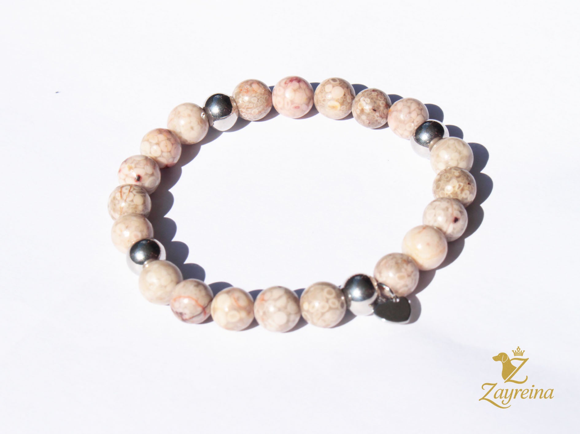 Bracelet élastique en pierre de chrysanthème avec détails en acier inoxydable.
