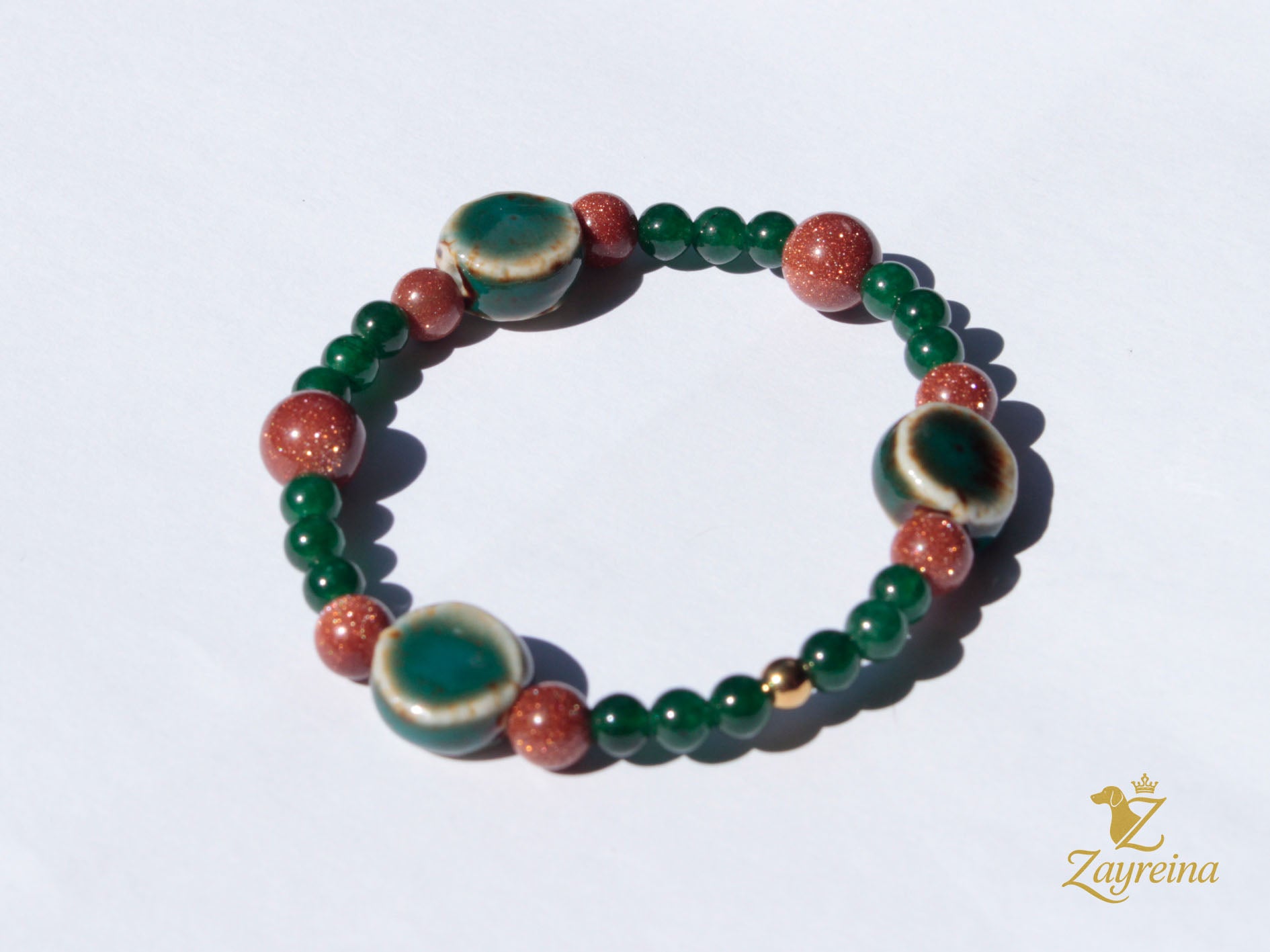 Bracelet élastique en jade vert, perles en céramique, pierre de soleil dorée scintillante et détail en acier inoxydable doré.