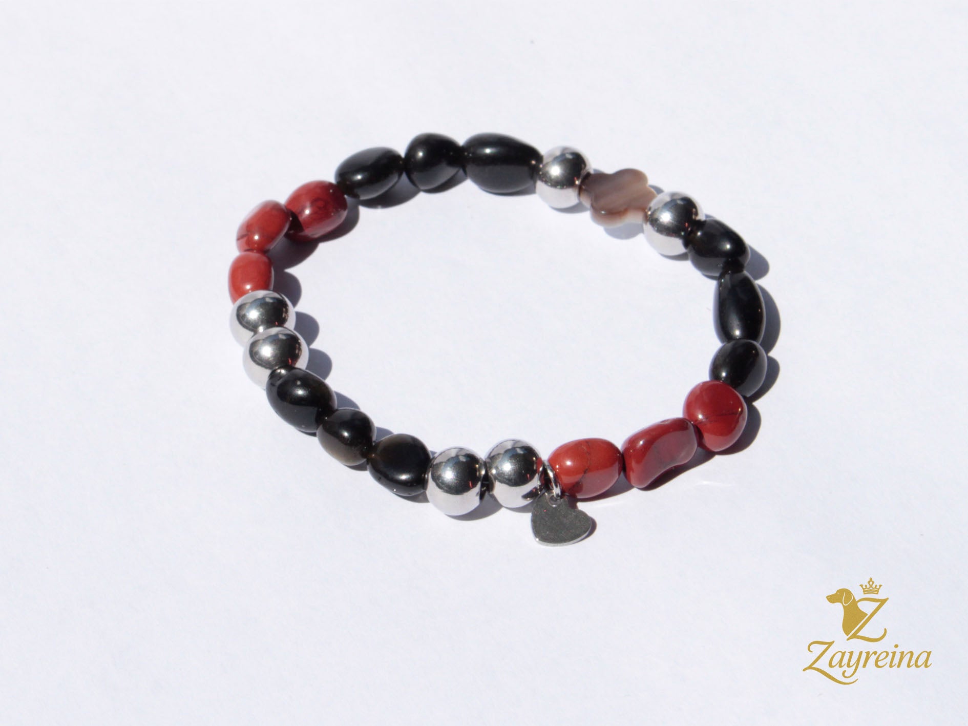Bracelet élastique en jaspe rouge, agate noire, trèfle en nacre naturelle et acier inoxydable.