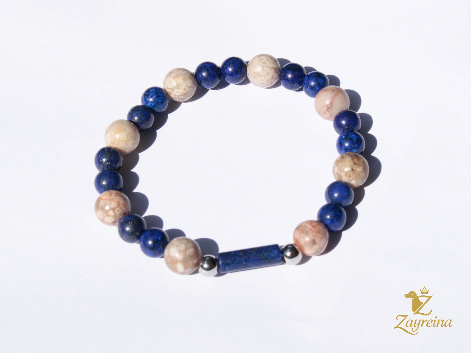 Bracelet élastique en lapis-lazuli, pierre de chrysanthème et détails en acier inoxydable.