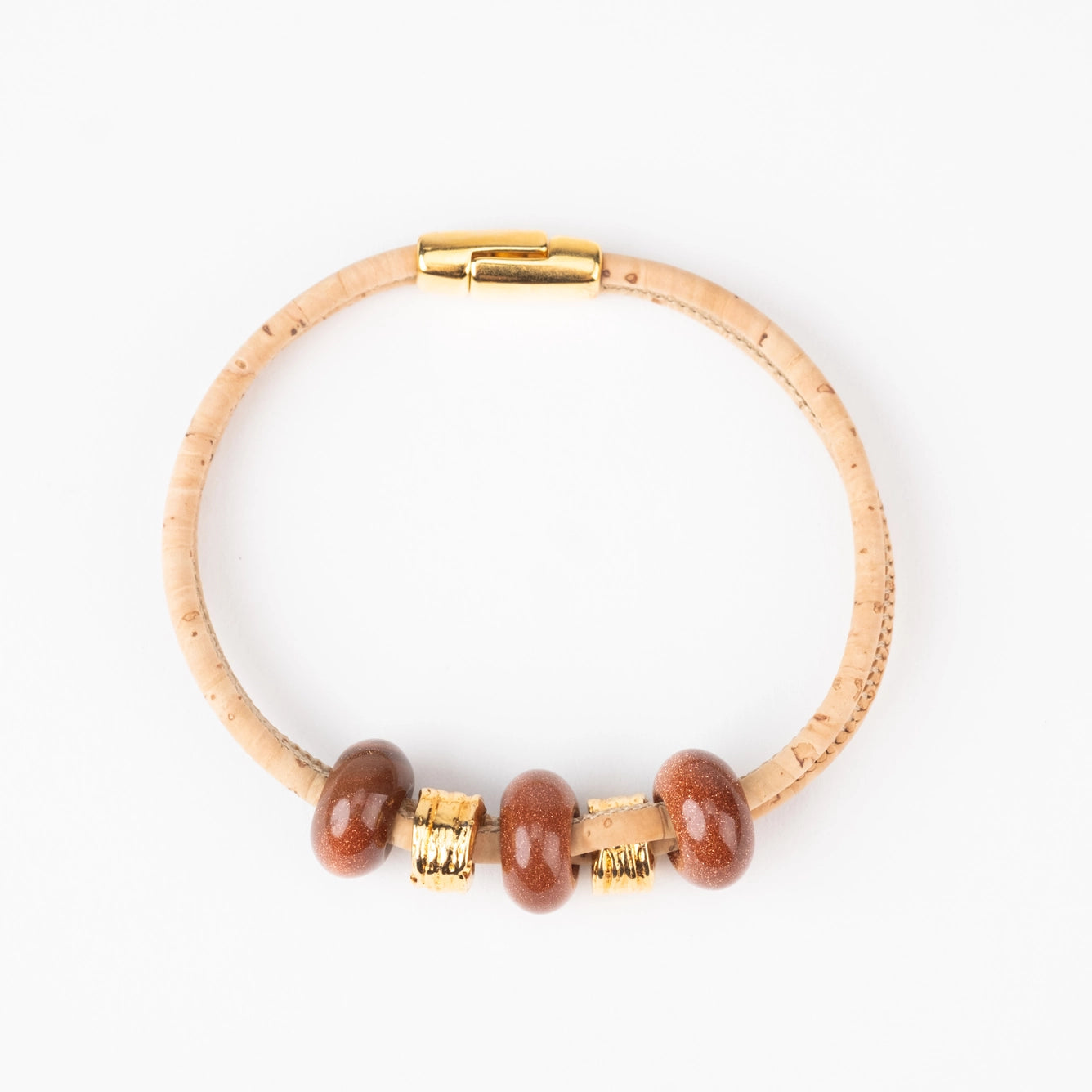 Ce bracelet élégant en liège naturel enveloppe le poignet avec confort et raffinement. Les céramiques marron apportent une teinte chaude et terreuse, rehaussée par les délicates touches dorées qui ajoutent une brillance subtile.