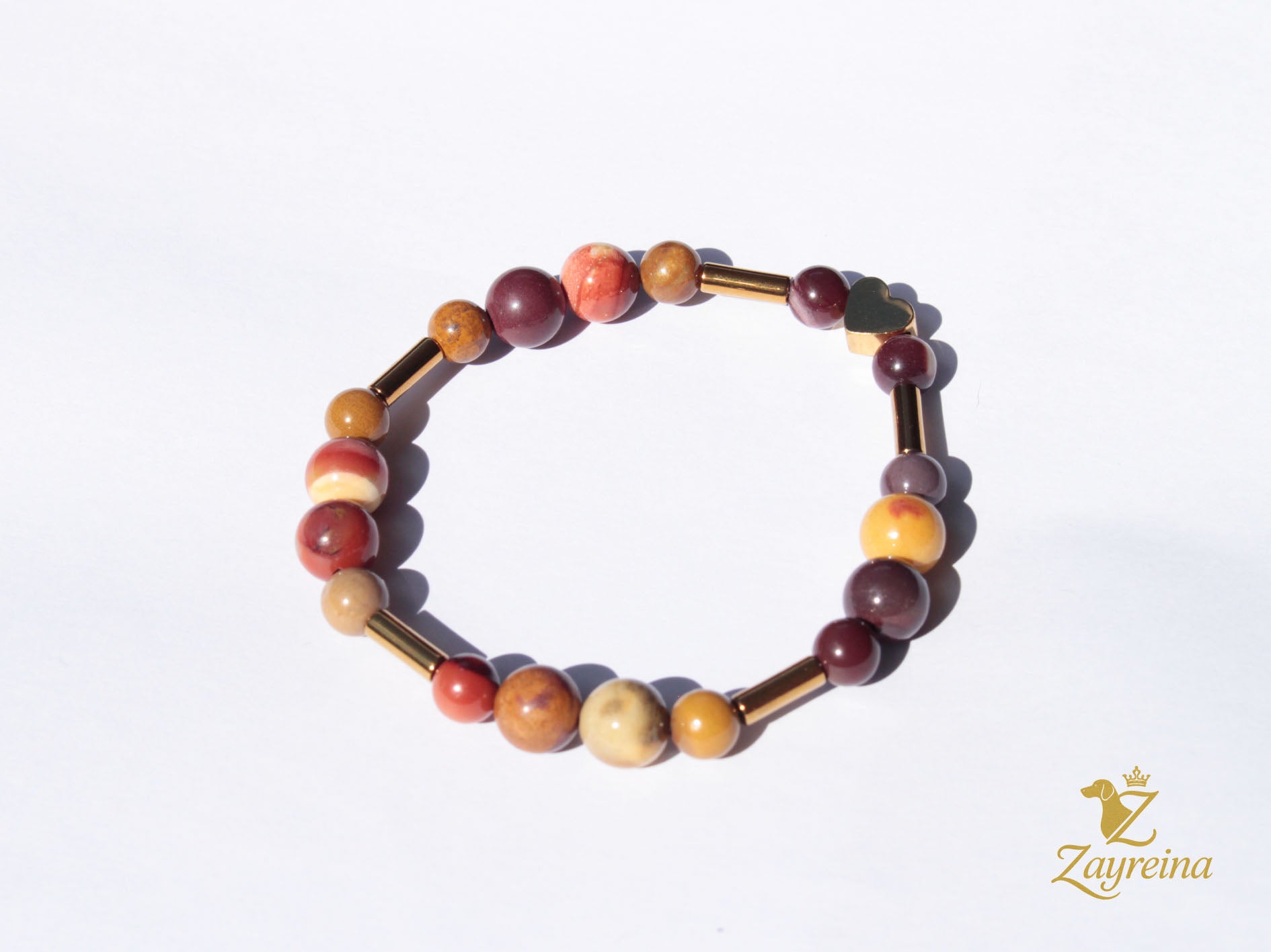Bracelet élastique en mookaite, tubes d’hématite dorée et détail en cœur en acier inoxydable doré.