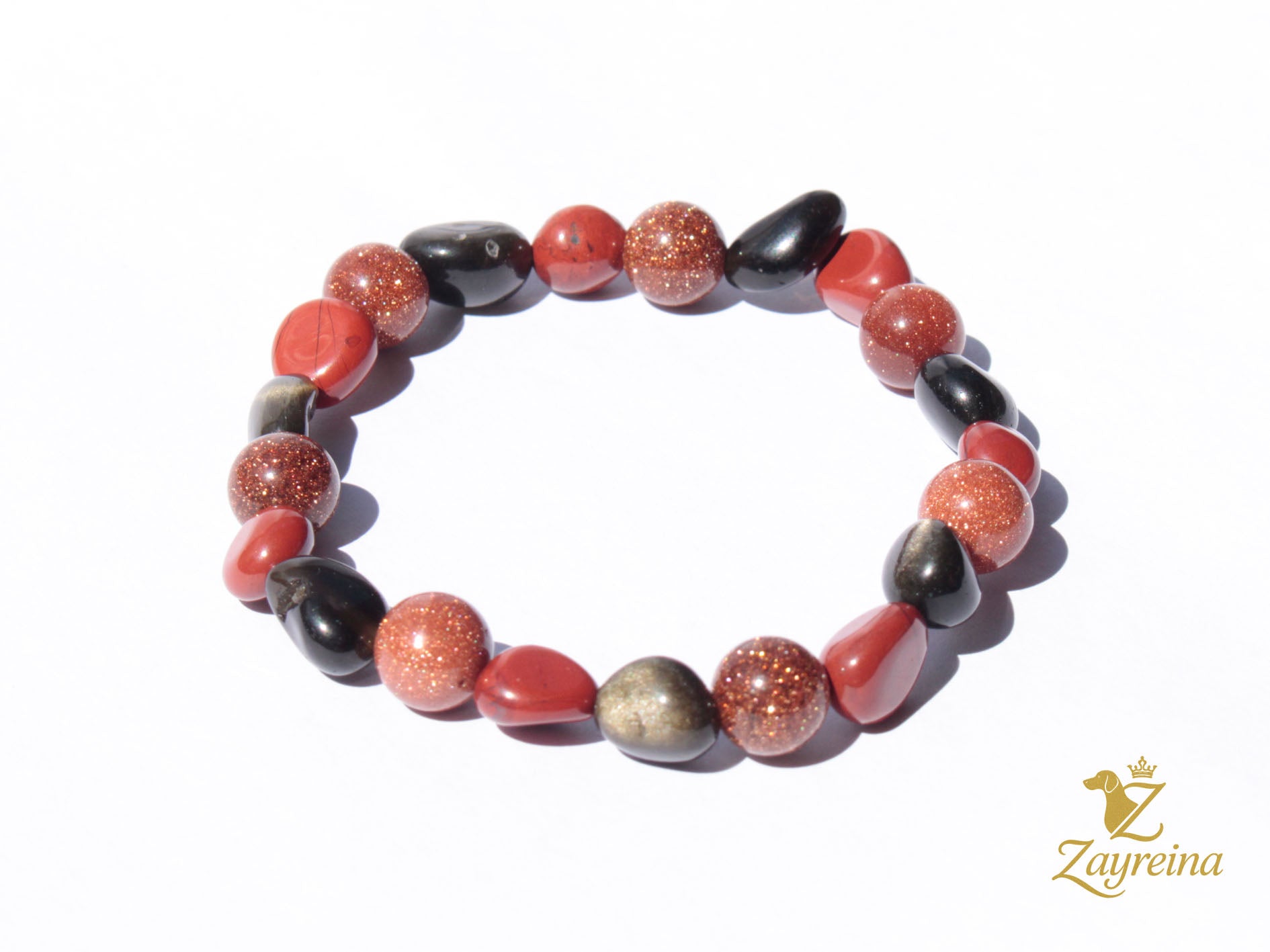 Bracelet élastique en pépites baroques d’obsidienne, granulés de jaspe rouge et pierres de soleil dorées scintillantes.