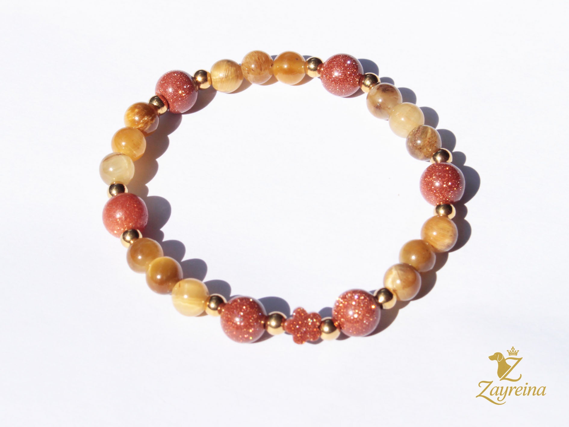 Bracelet élastique en œil de tigre doré, pierre de soleil dorée scintillante et détails en acier inoxydable doré.