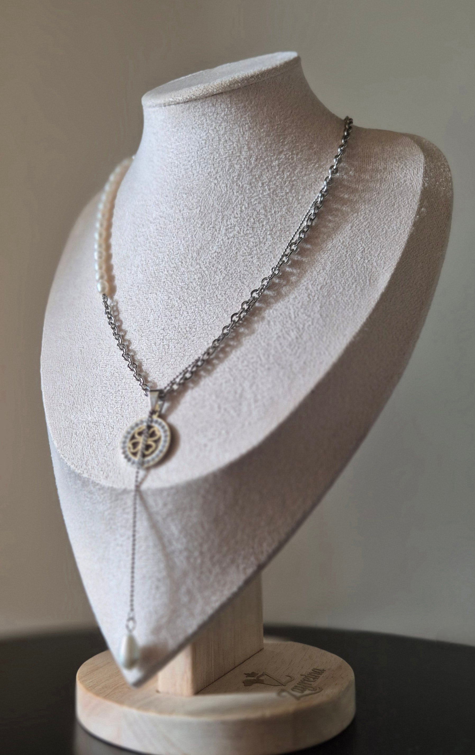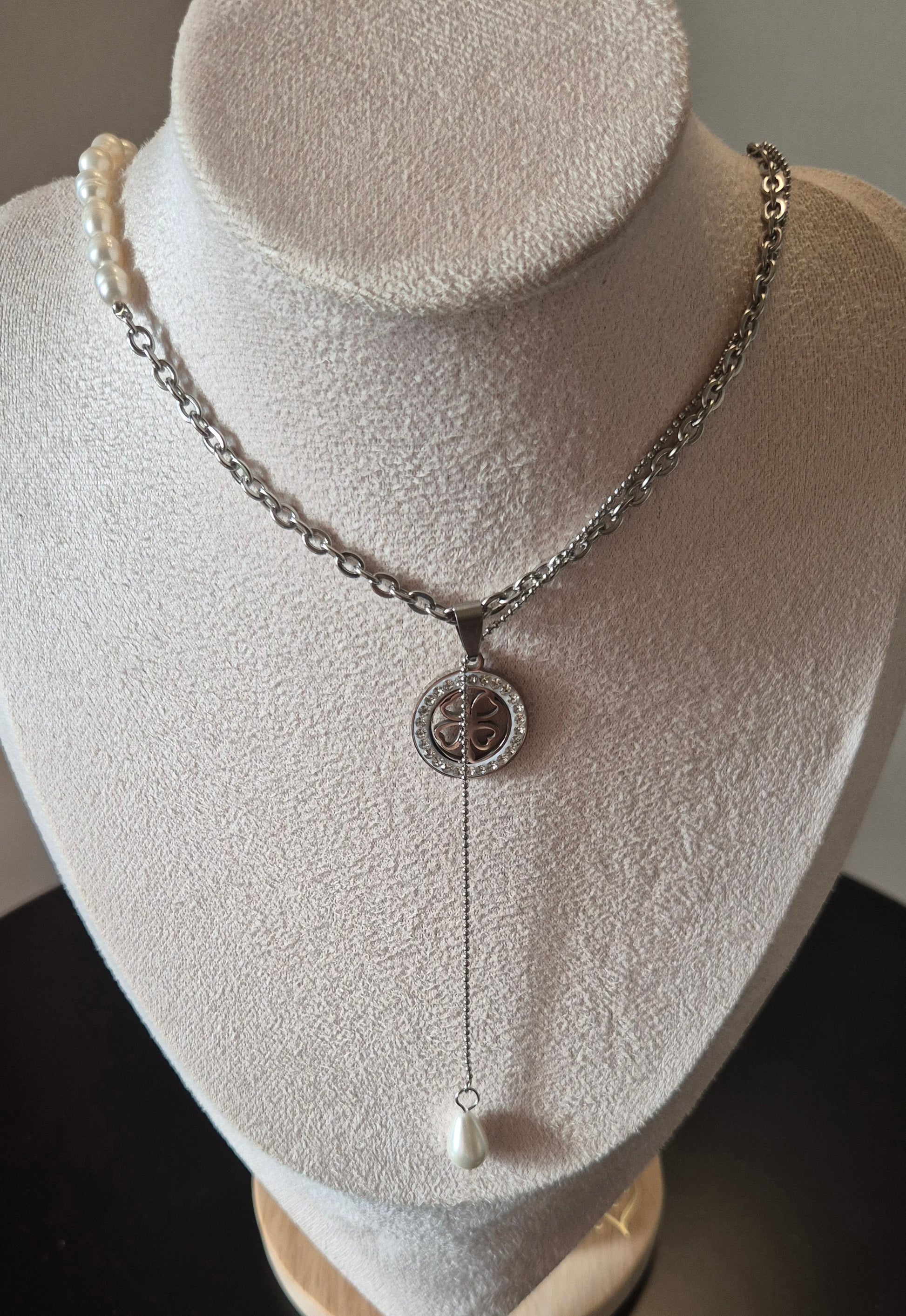 Collier fait main, composé d’un côté d’une chaîne en acier inoxydable argenté et de l’autre de perles naturelles, avec un pendentif en forme de trèfle. Environ 42 cm.