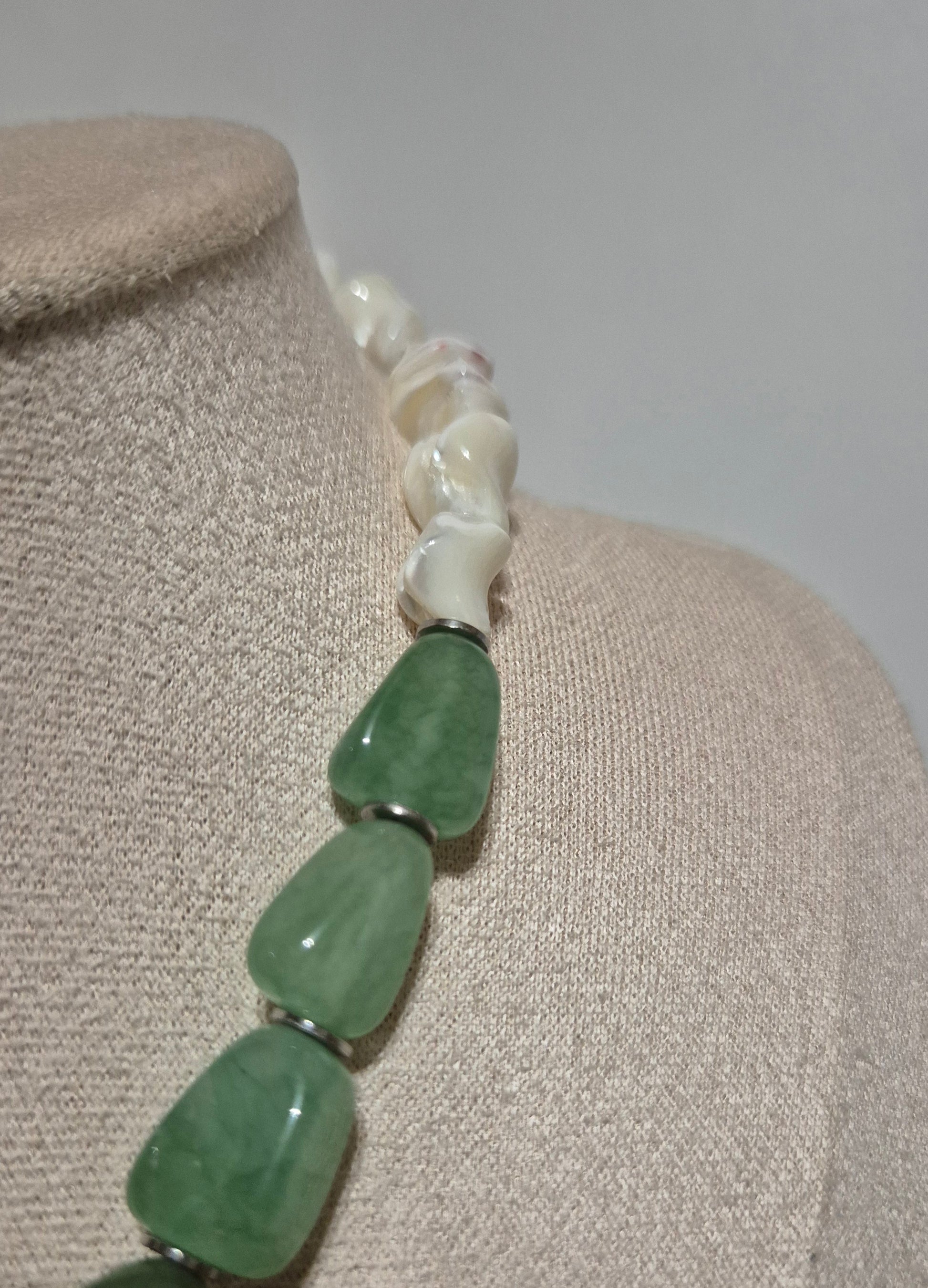 Collier fait main en fil d’acier, orné de grandes pierres d’aventurine verte en forme de triangles, de morceaux irréguliers de coquillage, d’une grande perle naturelle baroque & Coquillage et de délicats détails en acier inoxydable argenté. Environ 39 cm.
