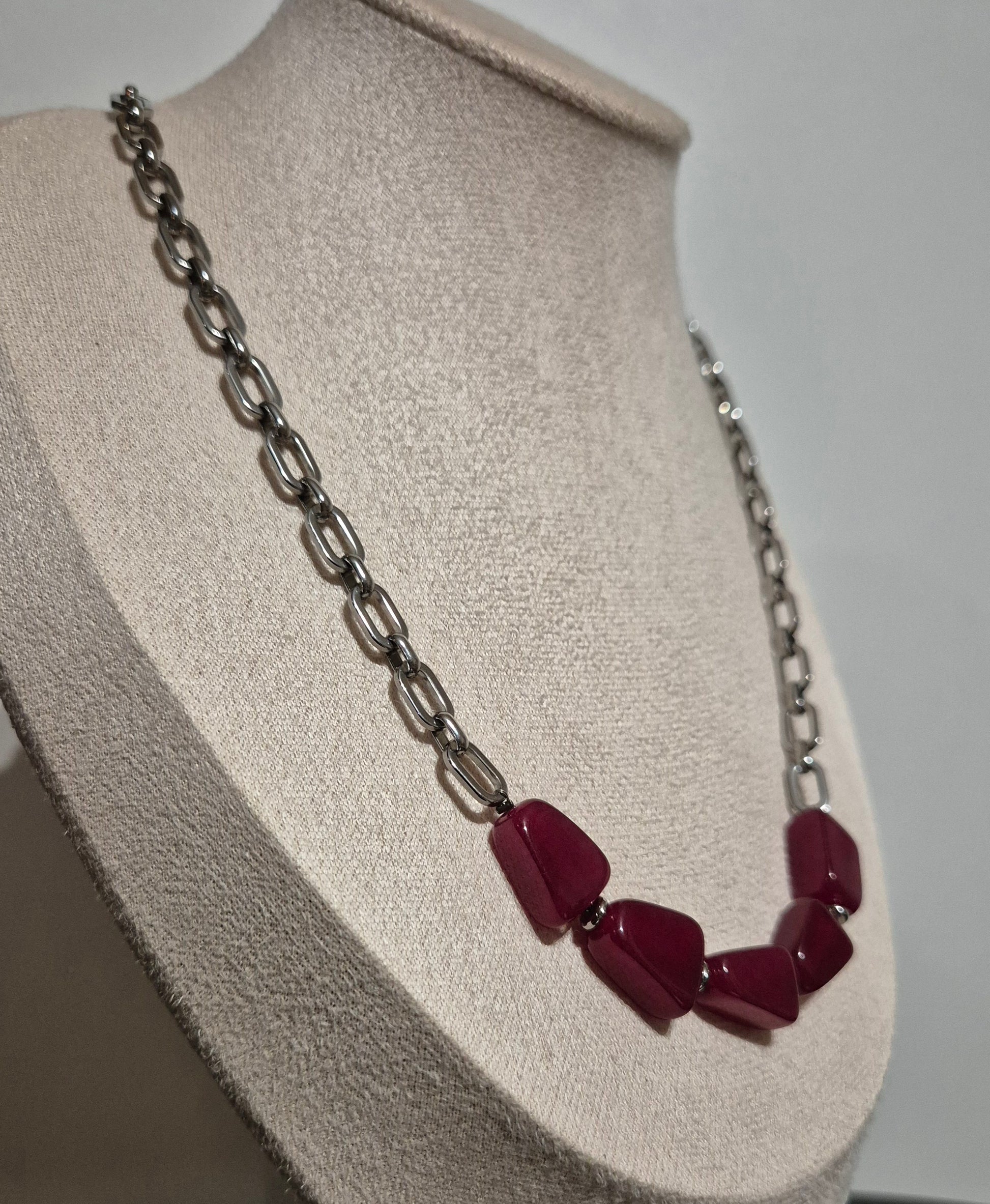 Collier fait main en chaîne d’acier inoxydable, orné de pierres de calcédoine rouge foncé en forme de triangles et de délicats détails en acier inoxydable argenté. Environ 49 cm.