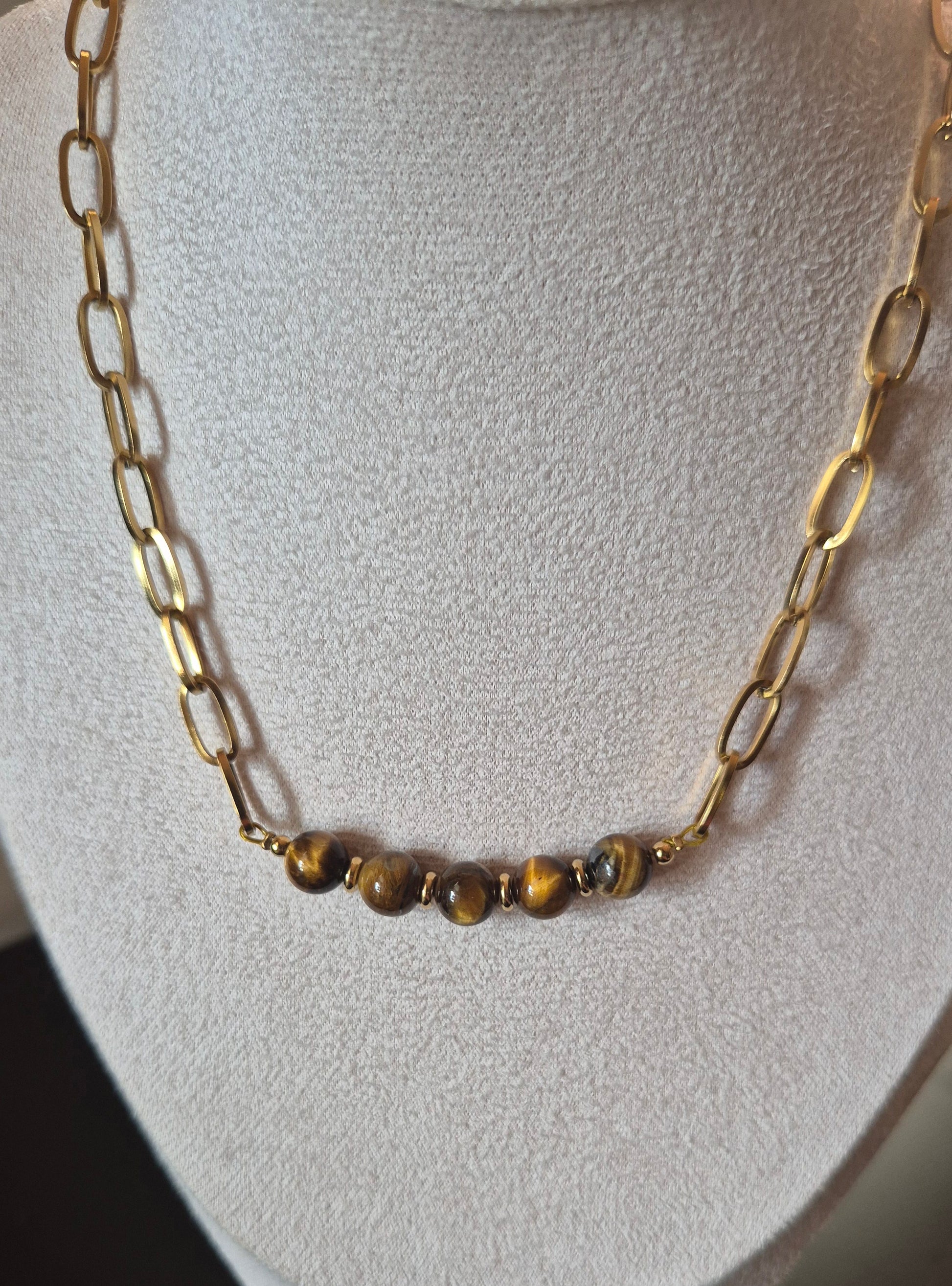 Collier fait main en chaîne d’acier inoxydable doré, orné de pierres d'oeil de tigre. Environ 40 cm.
