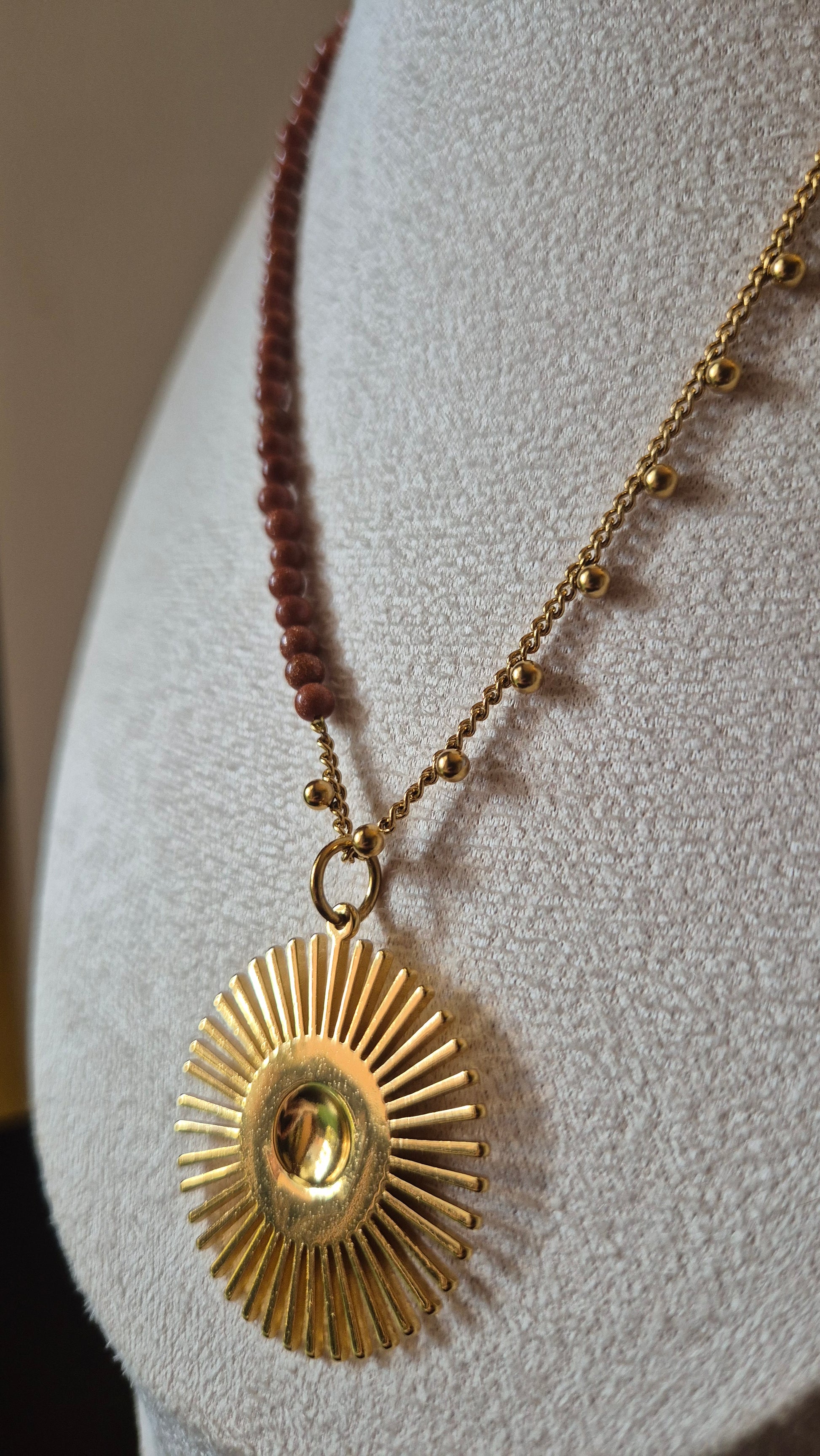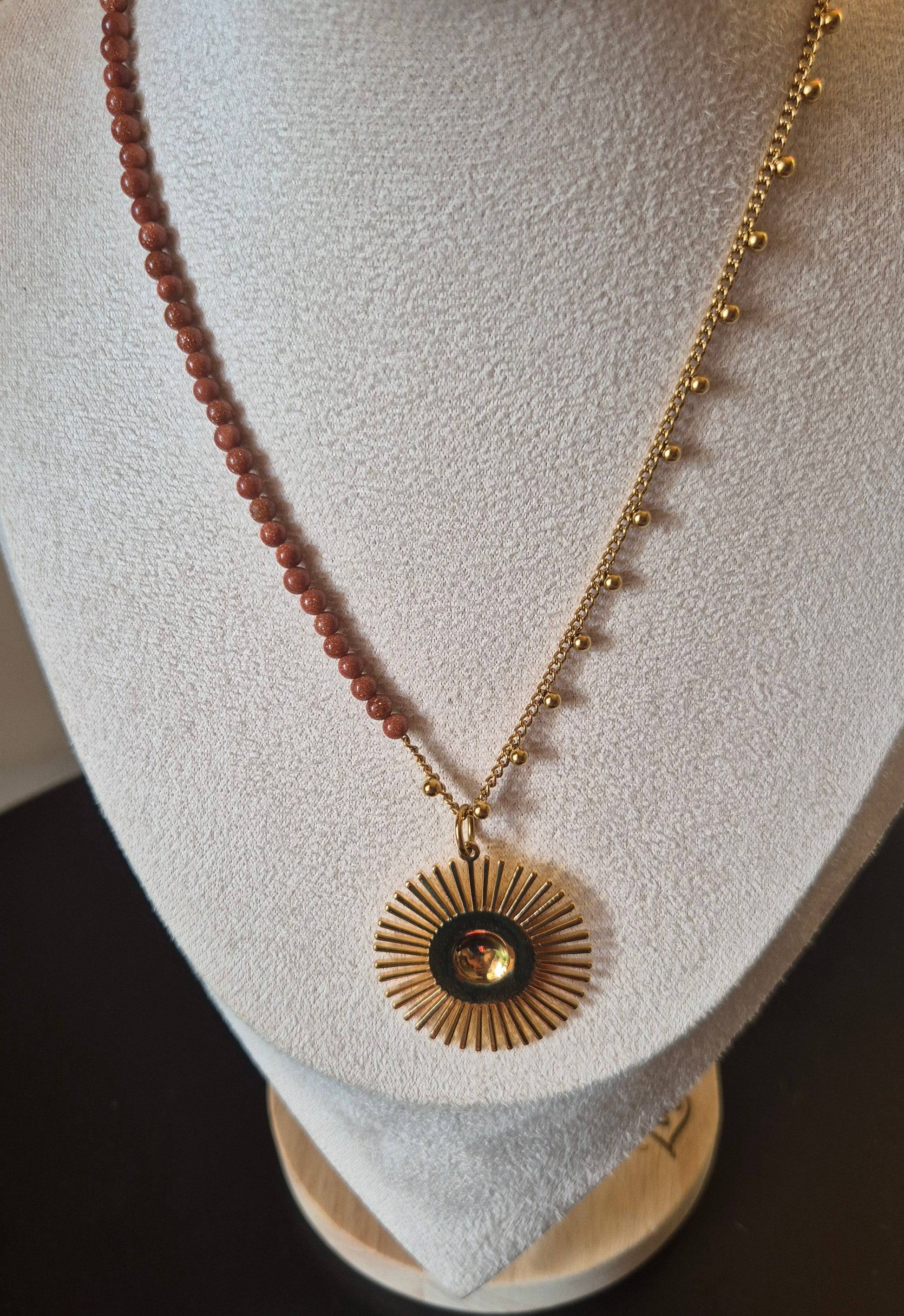 Collier fait main, composé pour moitié d’une chaîne d’acier inoxydable doré et pour moitié de pierres de soleil 4 mm, avec un pendentif. Environ 40 cm.