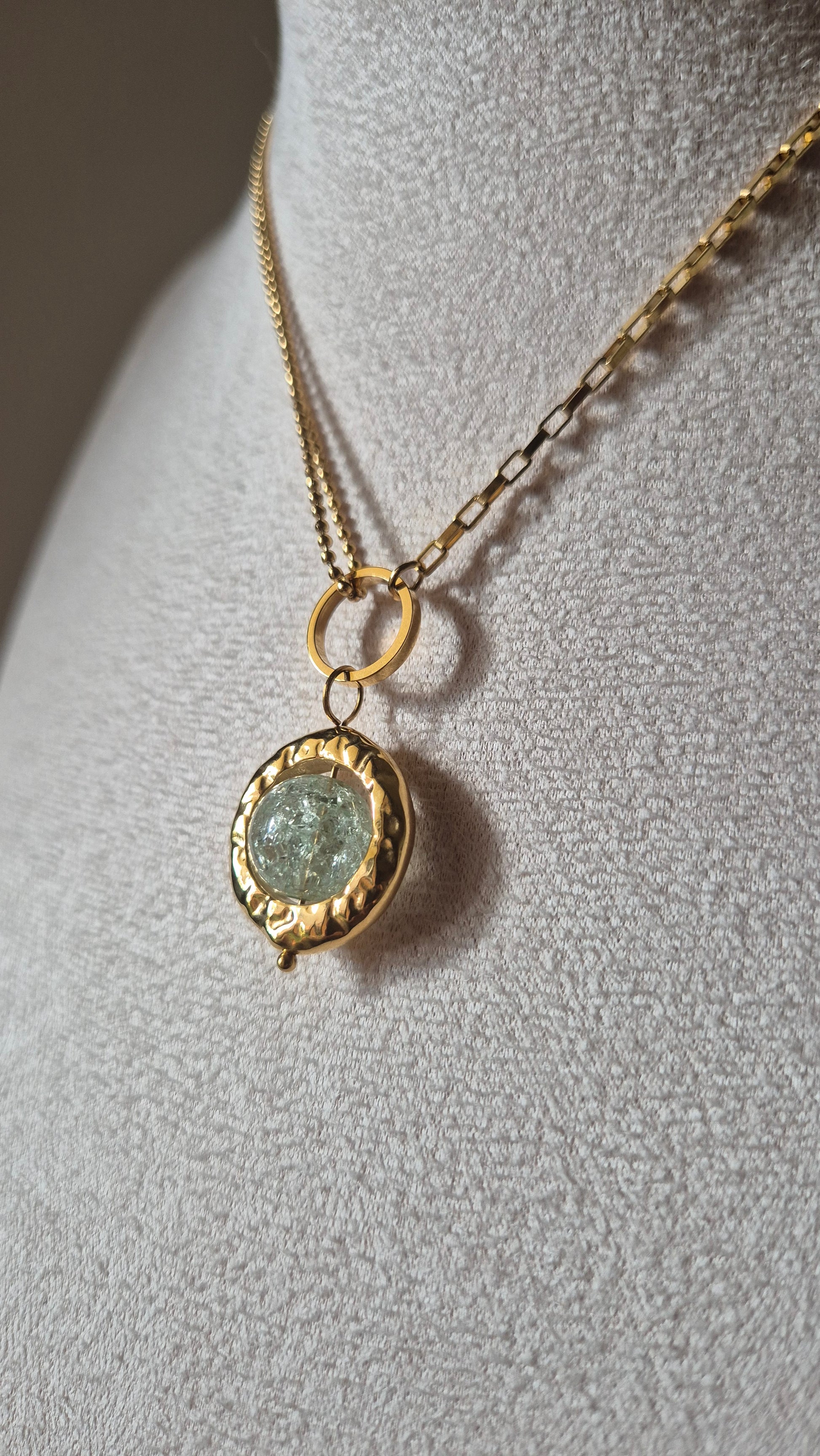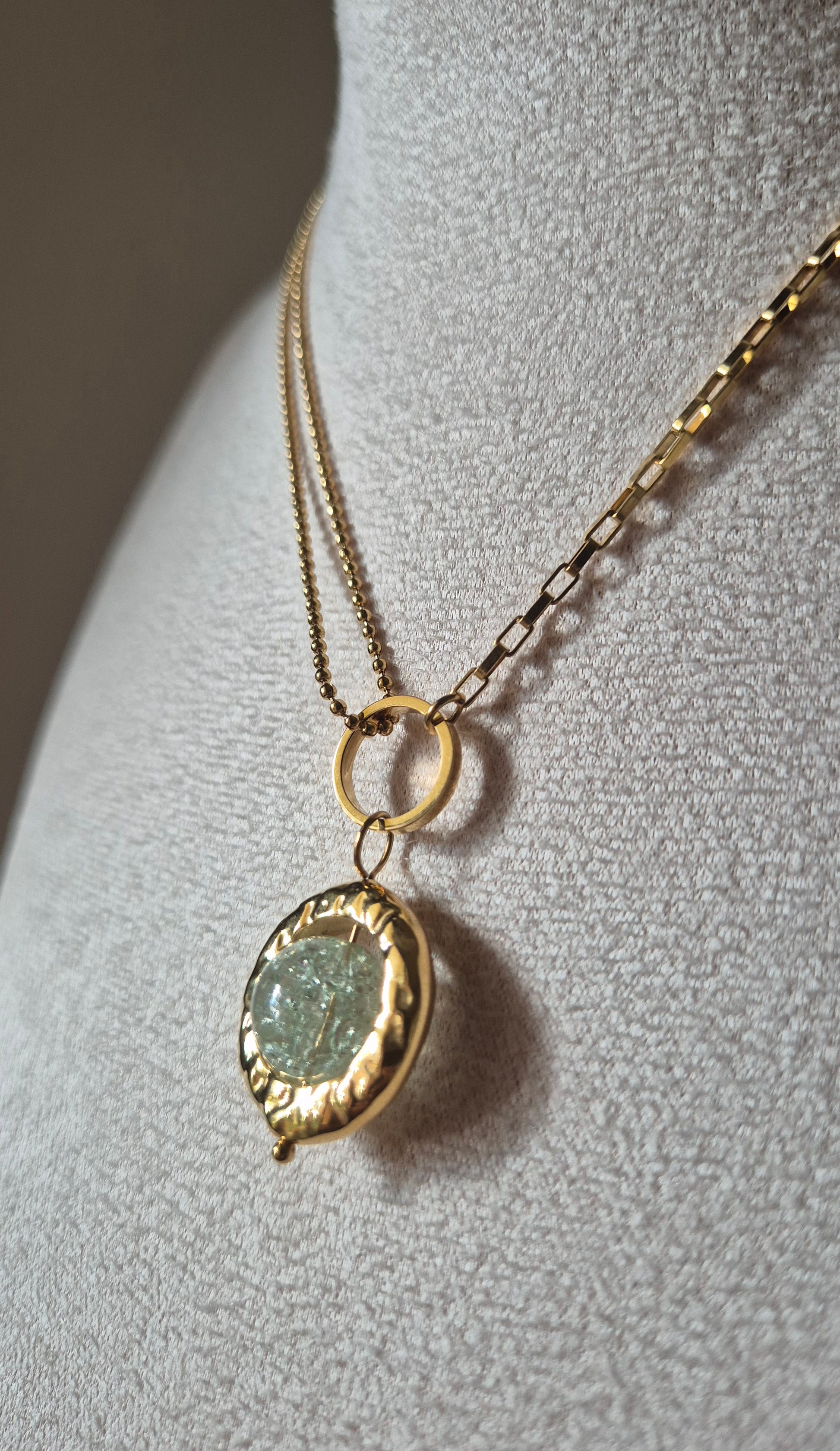 Collier fait main en fil d’acier inoxydable doré, agrémenté d’un pendentif. Environ 36 cm.