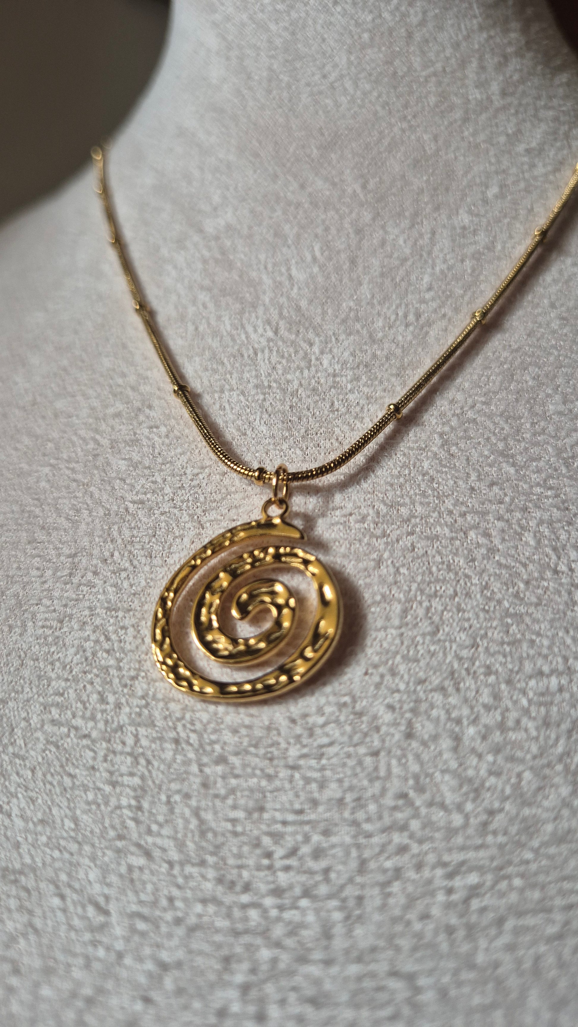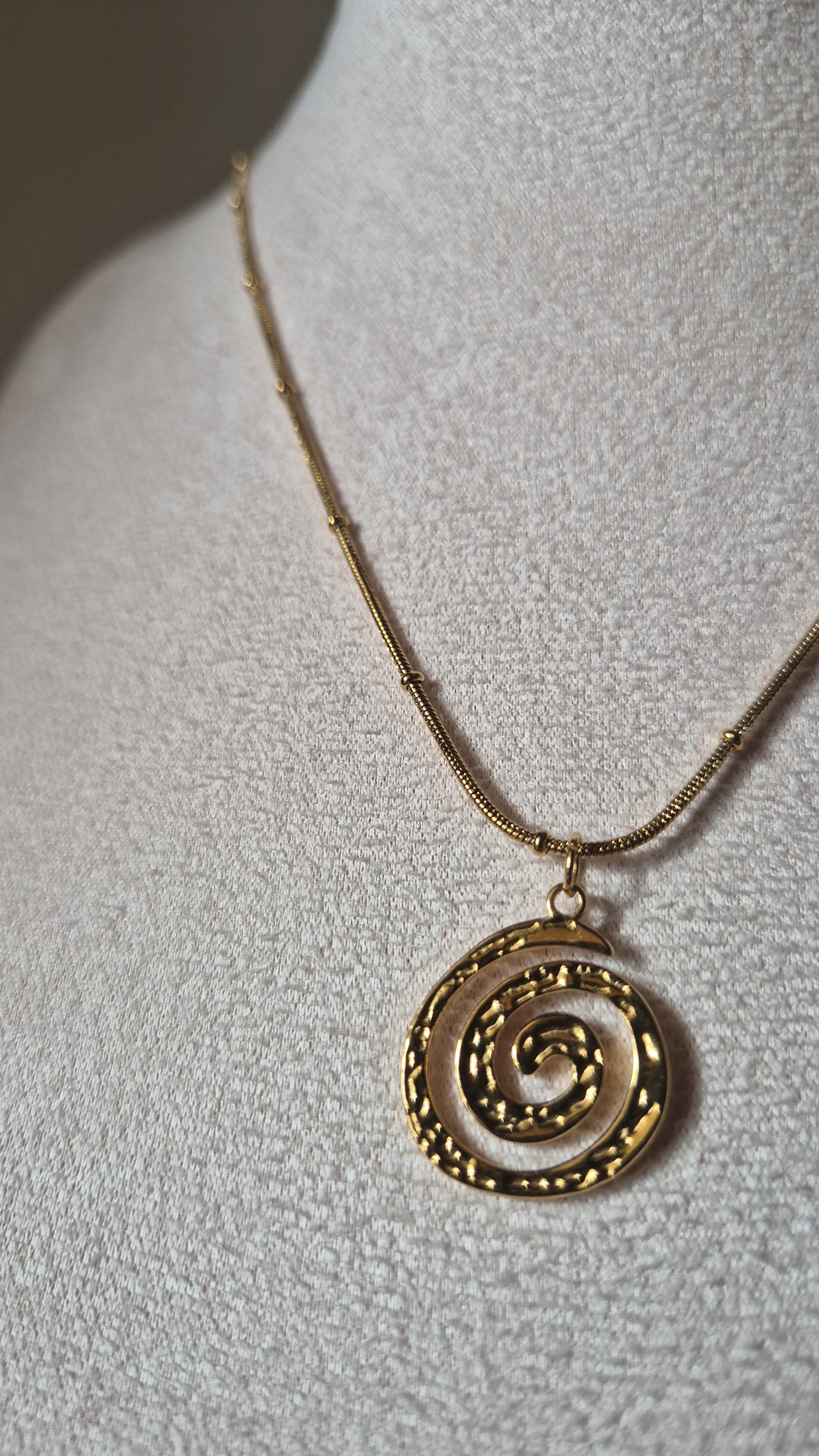 Collier fait main en fil d’acier inoxydable doré, agrémenté d’un pendentif en forme de spirale. Environ 43 cm.