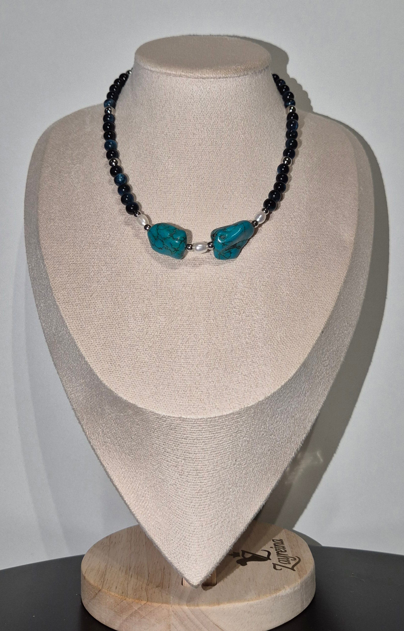 Collier fait main en fil d’acier, orné de perles d’œil de tigre bleu, deux pierres turquoise, et trois perles naturelles avec délicats détails en acier inoxydable argenté. Environ 37 cm.