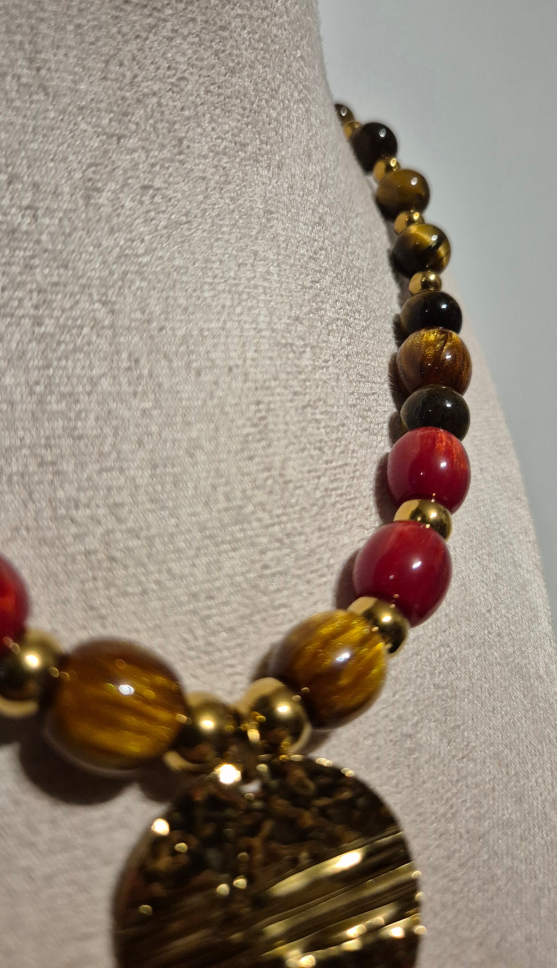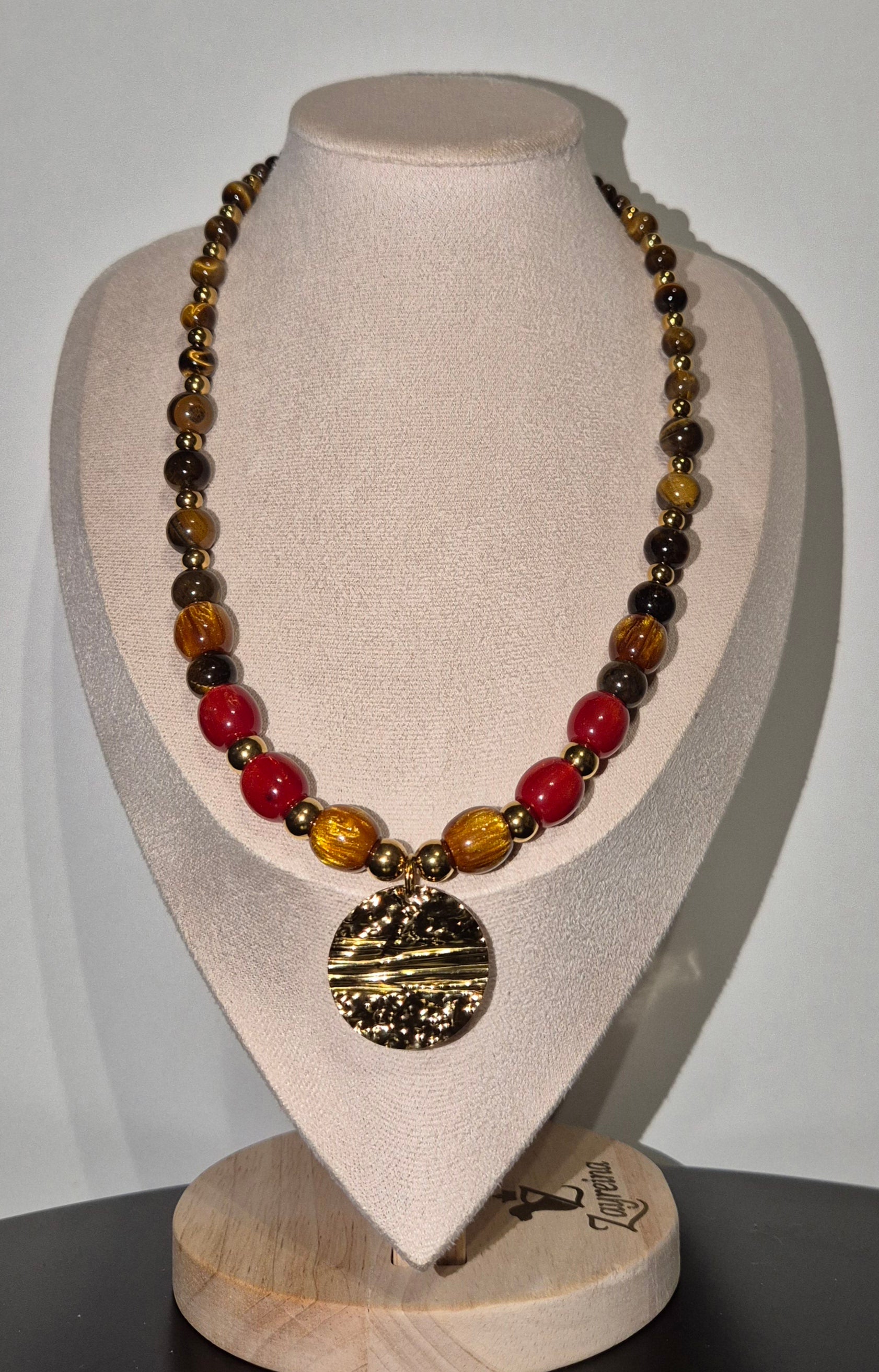 Collier fait main en fil d’acier, orné de perles de résine rouge et dorée, de pierres d’œil de tigre, de perles en acier inoxydable doré et d’une médaille assortie. Environ 52 cm.