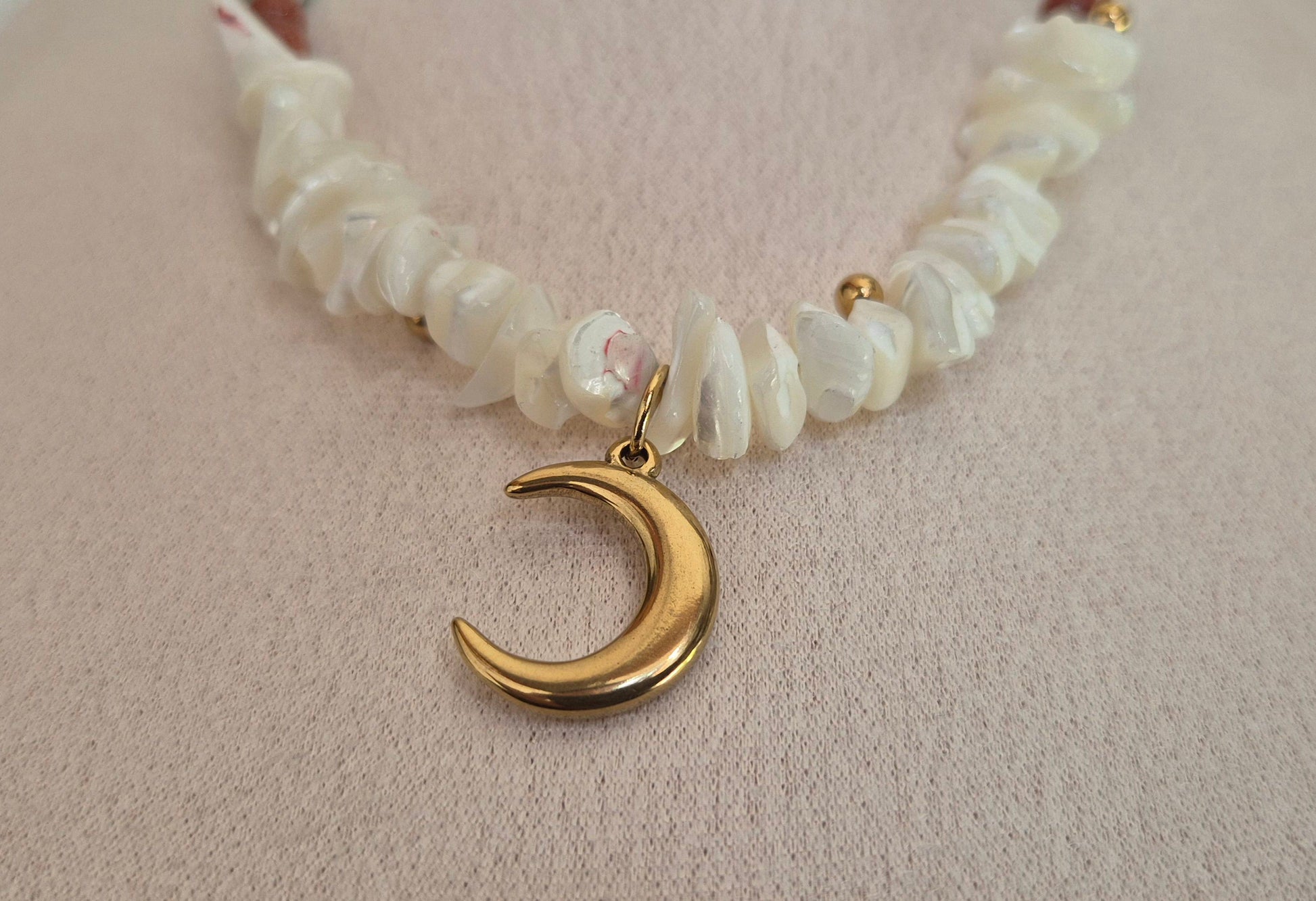 Collier fait main en fil d’acier, avec des éclats de coquillage naturel, des pierres naturelles blanches et vertes, des détails de petites perles en acier inoxydable doré et de la pierre de soleil, avec un pendentif lune en acier doré. Environ 40 cm.