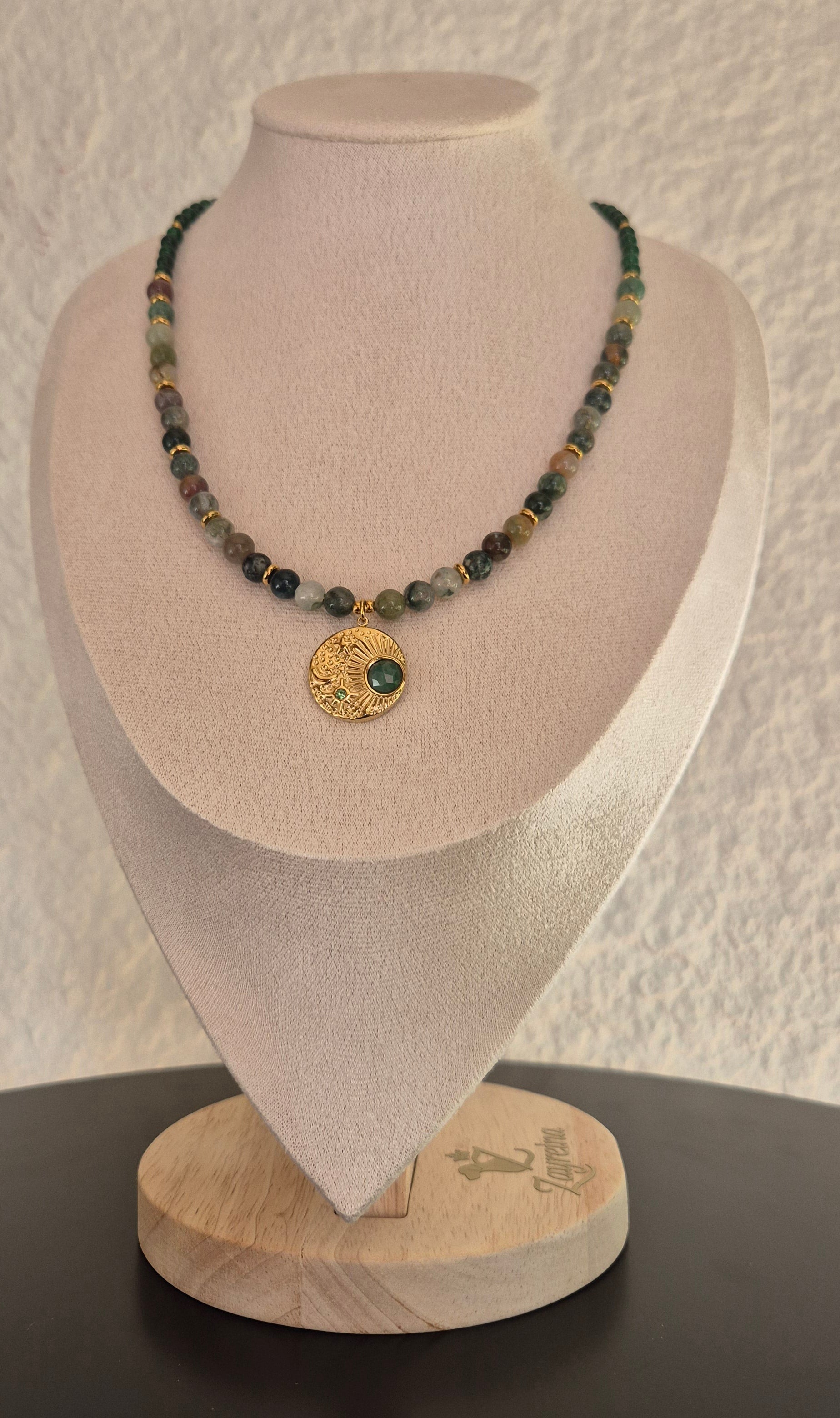 Collier fait main en fil d’acier, avec des perles naturelles de quartz vert, détails en acier inoxydable doré et un pendentif doré. Environ 43 cm.