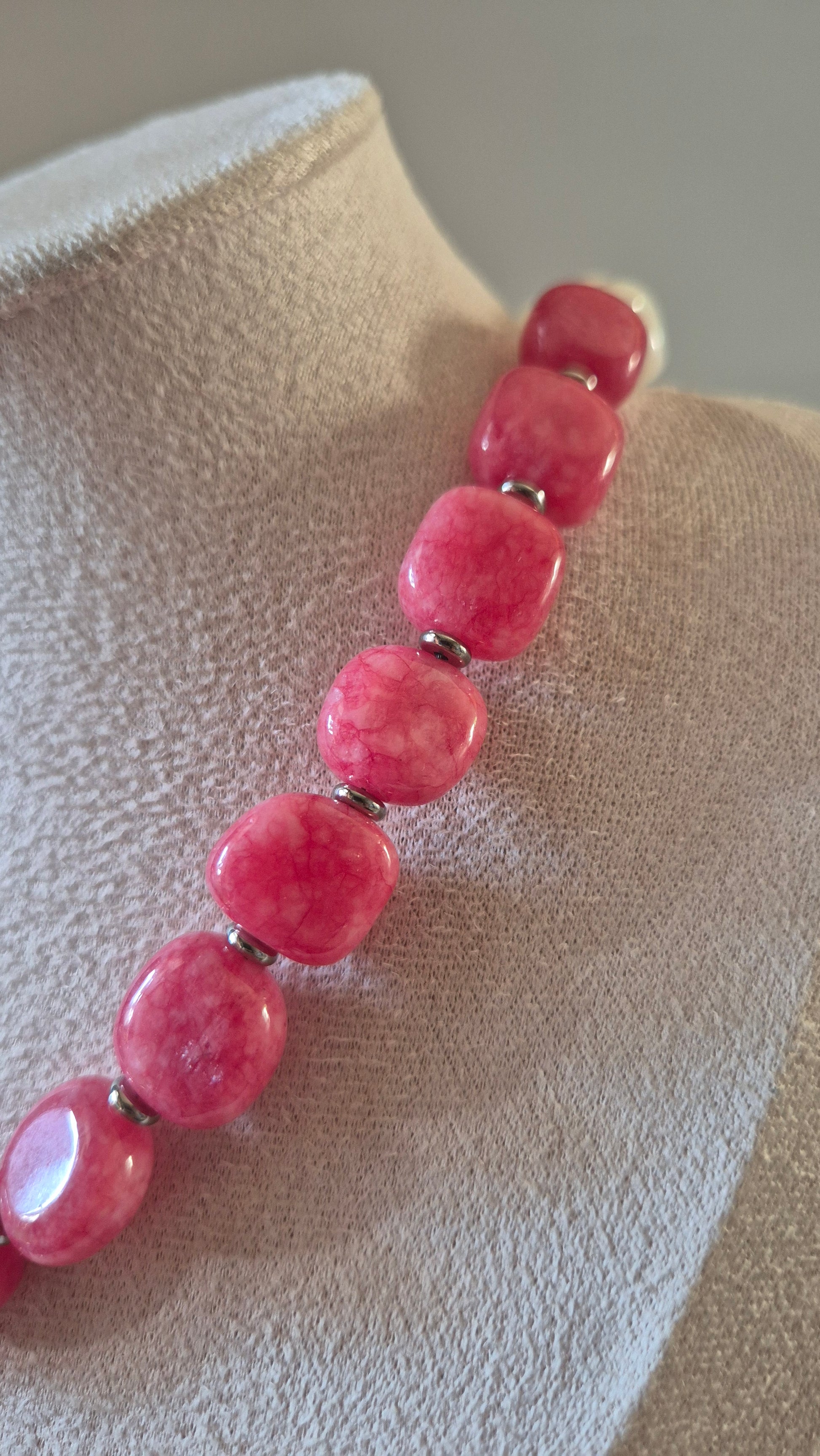 Collier fait main en fil d’acier, orné de perles de rhodochrosite rose, d’une perle naturelle baroque et de morceaux irréguliers de coquillage, avec des détails en acier inoxydable argenté. Environ 40 cm.
