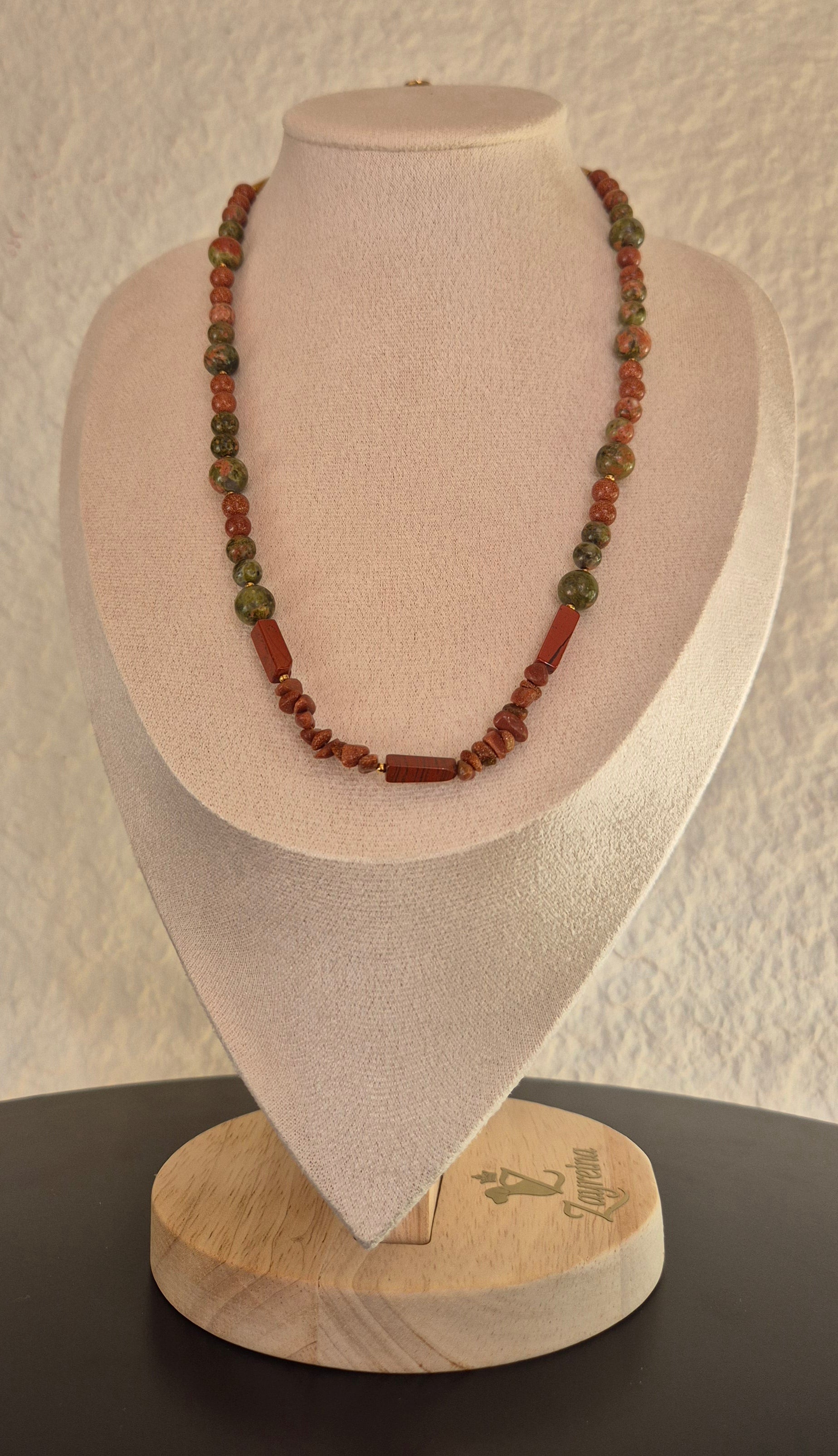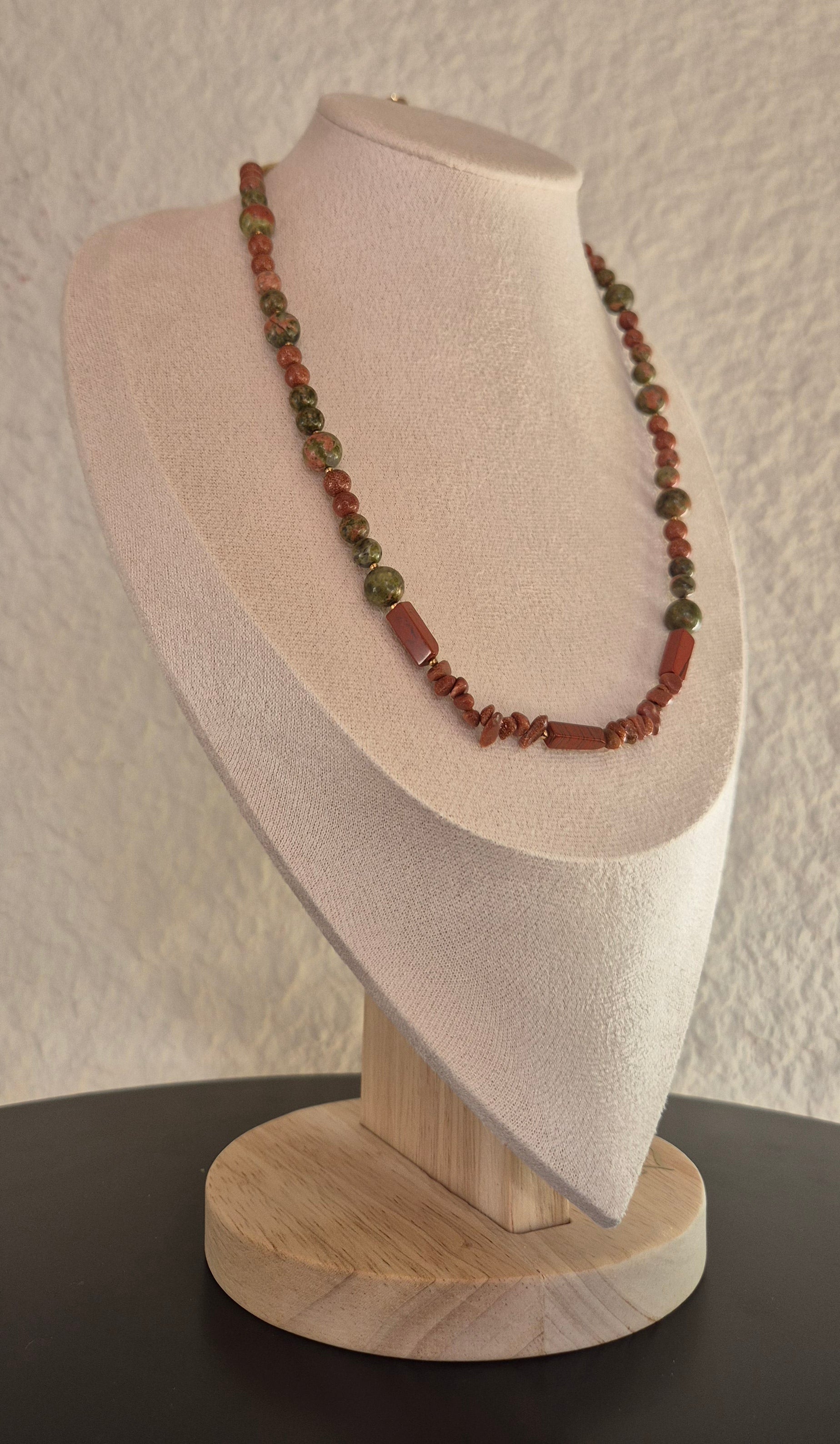 Collier fait main en fil d’acier, avec des pierres naturelles d’unakite, de pierre de soleil brillante, jaspe rouge et des détails en acier inoxydable doré. Environ 50 cm.